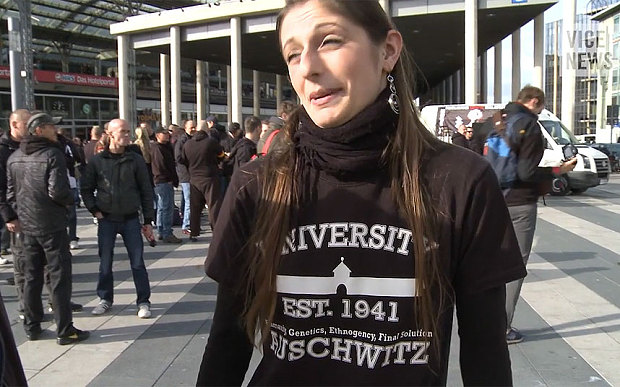 Czegóż to ludzie nie wymyślą...pani z koszulką "Auschwitz University - Est. 1941" na demonstracji anty-islamskiej w Kolonii :scratch .